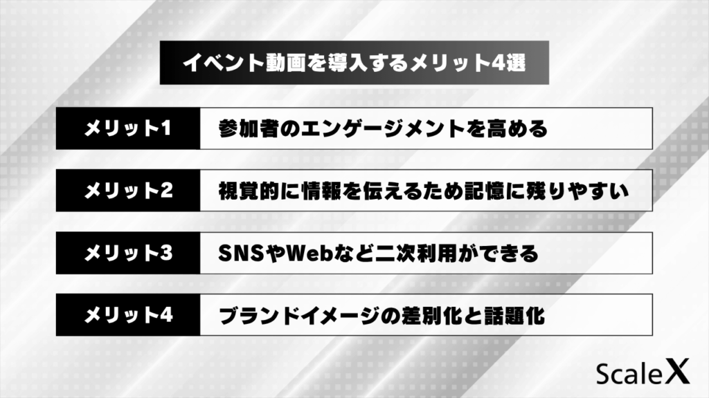イベント動画は、単なる記録映像以上の価値を持ちます。ここでは、動画を制作・活用する4つの大きなメリットを解説します。