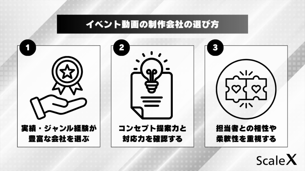 理想の動画を実現するには、信頼できるパートナー選びが不可欠です。以下の3つのポイントを必ずチェックしましょう。