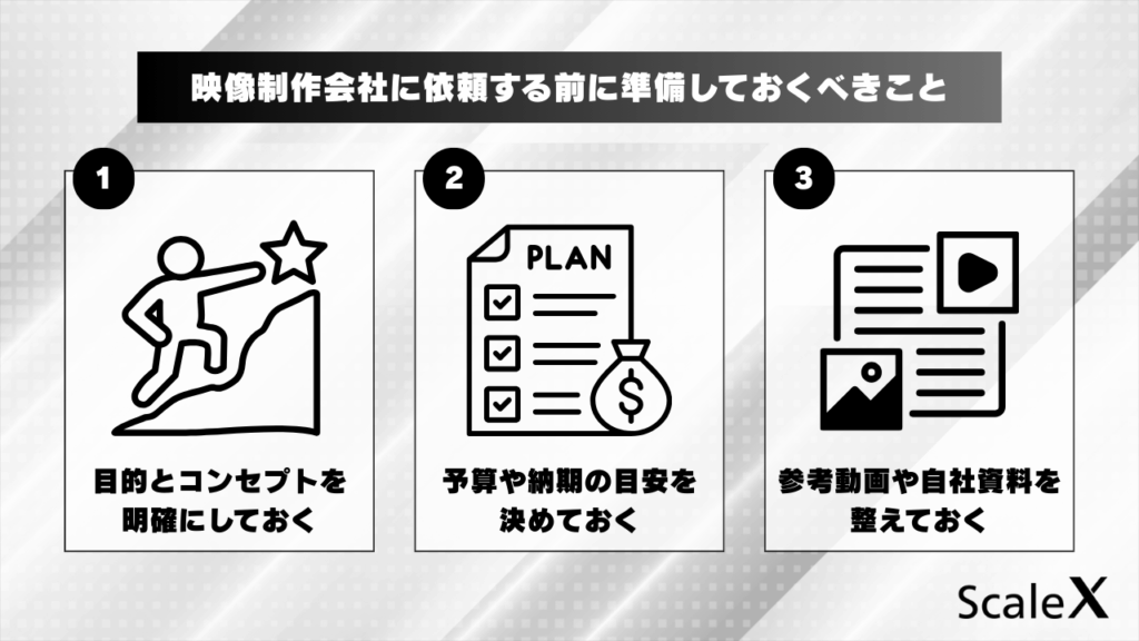 制作会社との打ち合わせをスムーズに進め、より効果的な動画を制作するためには、事前の準備が欠かせません。依頼前に以下の3点を整理しておきましょう。