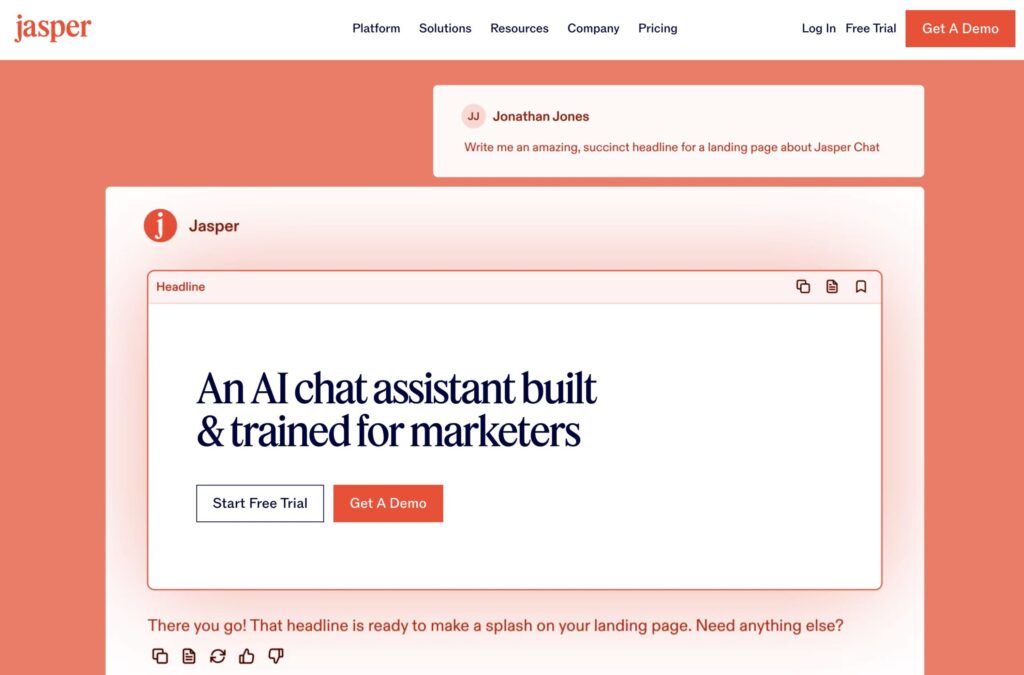 最大の特徴は、ブログ記事や広告コピー、SNS投稿といったマーケティングコンテンツの作成に特化している点です。JasperはもともとAIライティングツールとして高い評価を得ており、そのチャット版であるJasper Chatも、単なる対話だけでなく「成果を出すための文章作成」を強力に支援します。ブランドのトーン&マナーを学習させ、それに沿った文章を生成する機能や、SEOに強い記事構成を提案する機能など、ビジネス利用に最適化されています。