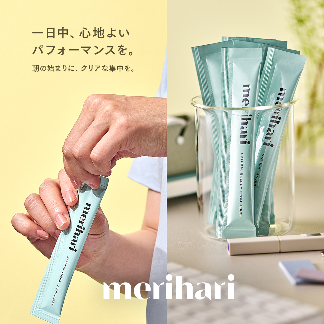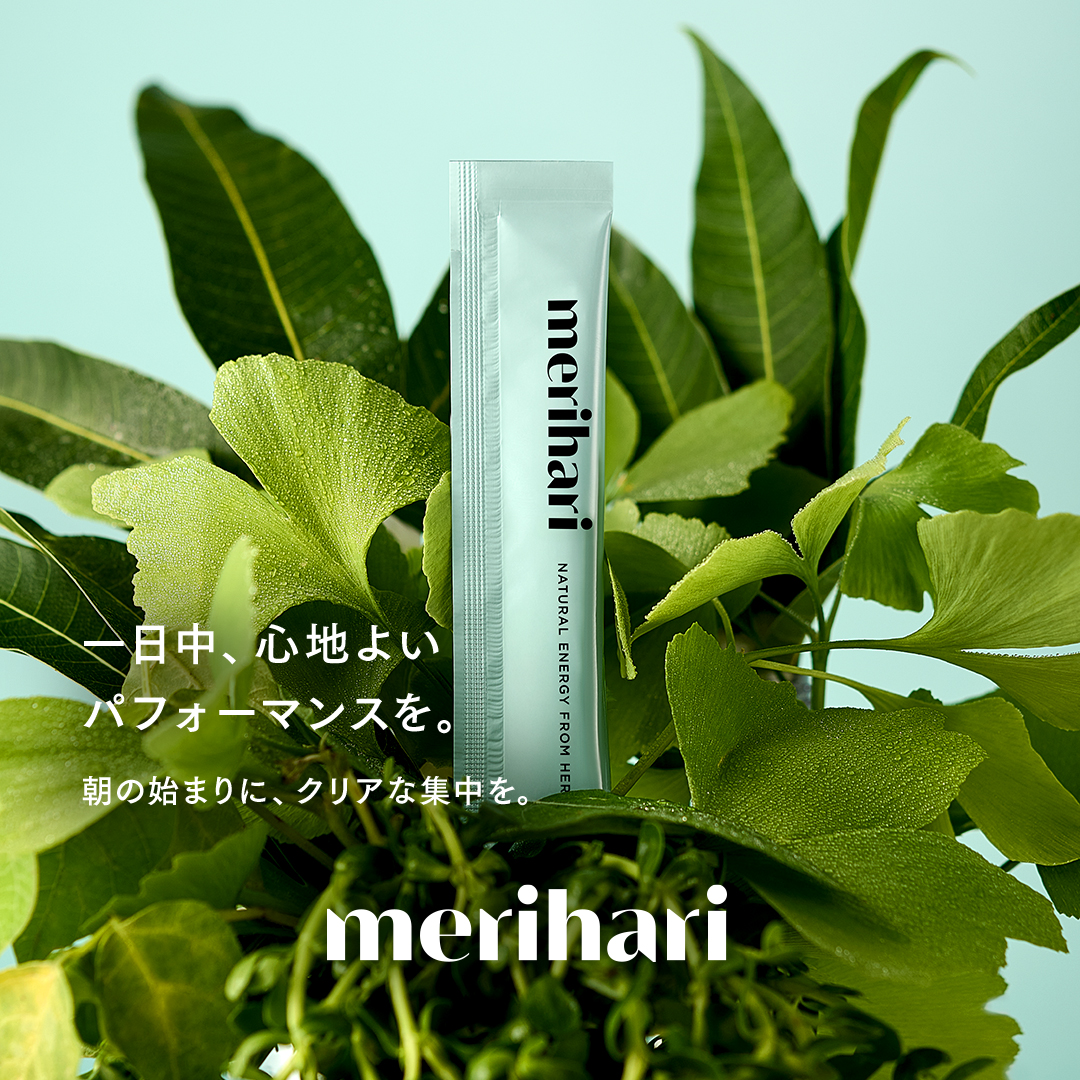 merihariは、カフェインや添加物に頼らず、100%天然ハーブ由来のエナジー成分で“集中”と“リラックス”のバランスを整えるナチュラルエナジーゼリーです。植物性天然由来成分を中心に、99%自然な食材でつくられており、頑張る時も休む時もやさしくコンディションをサポートします。